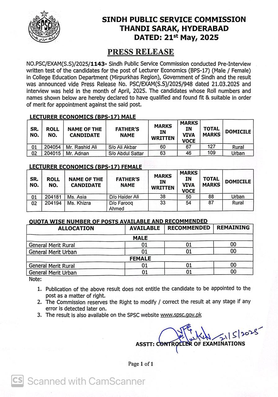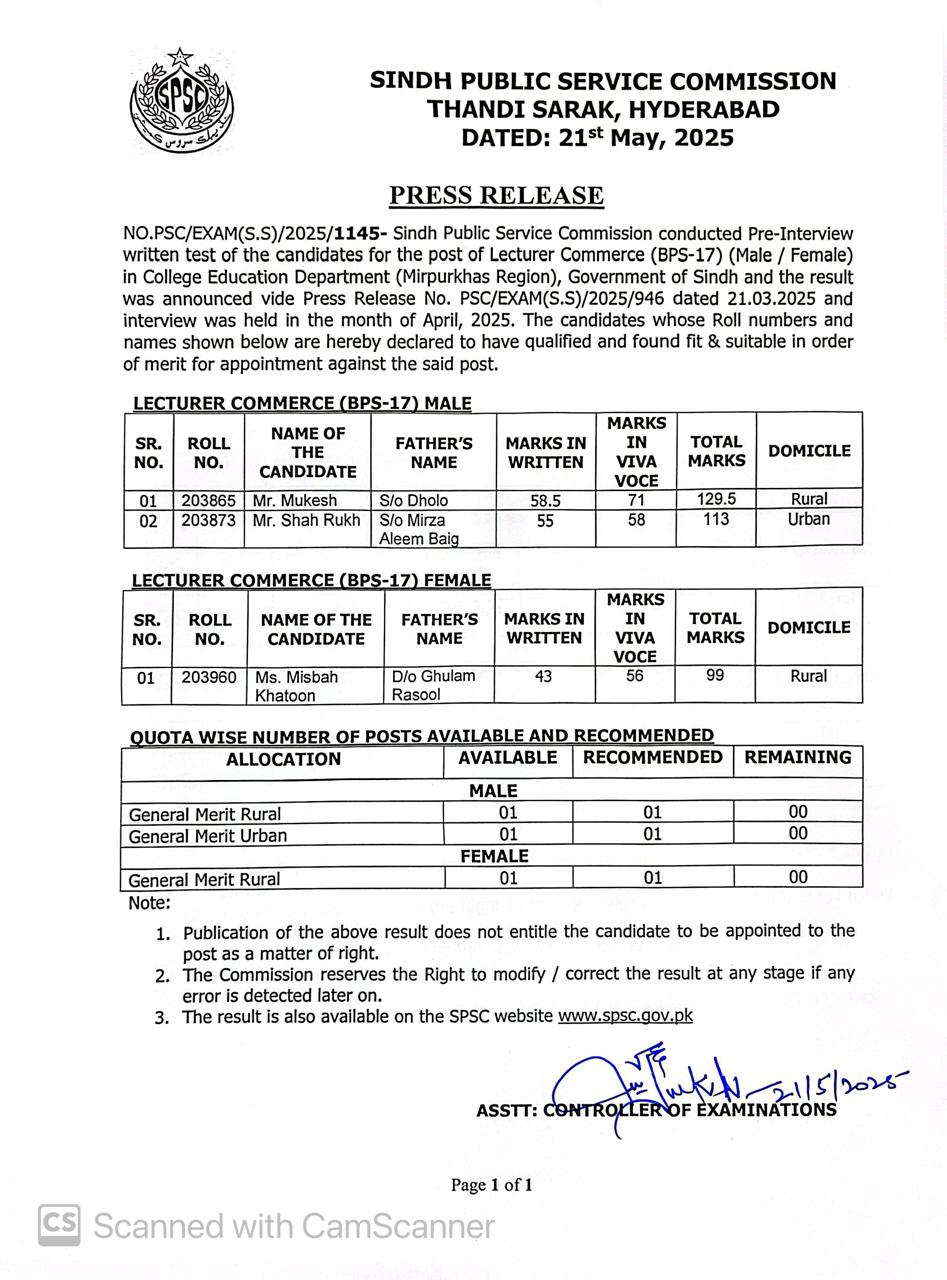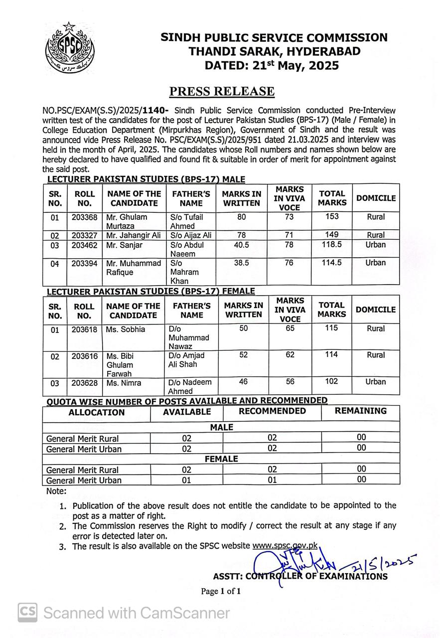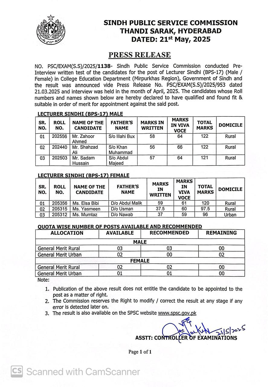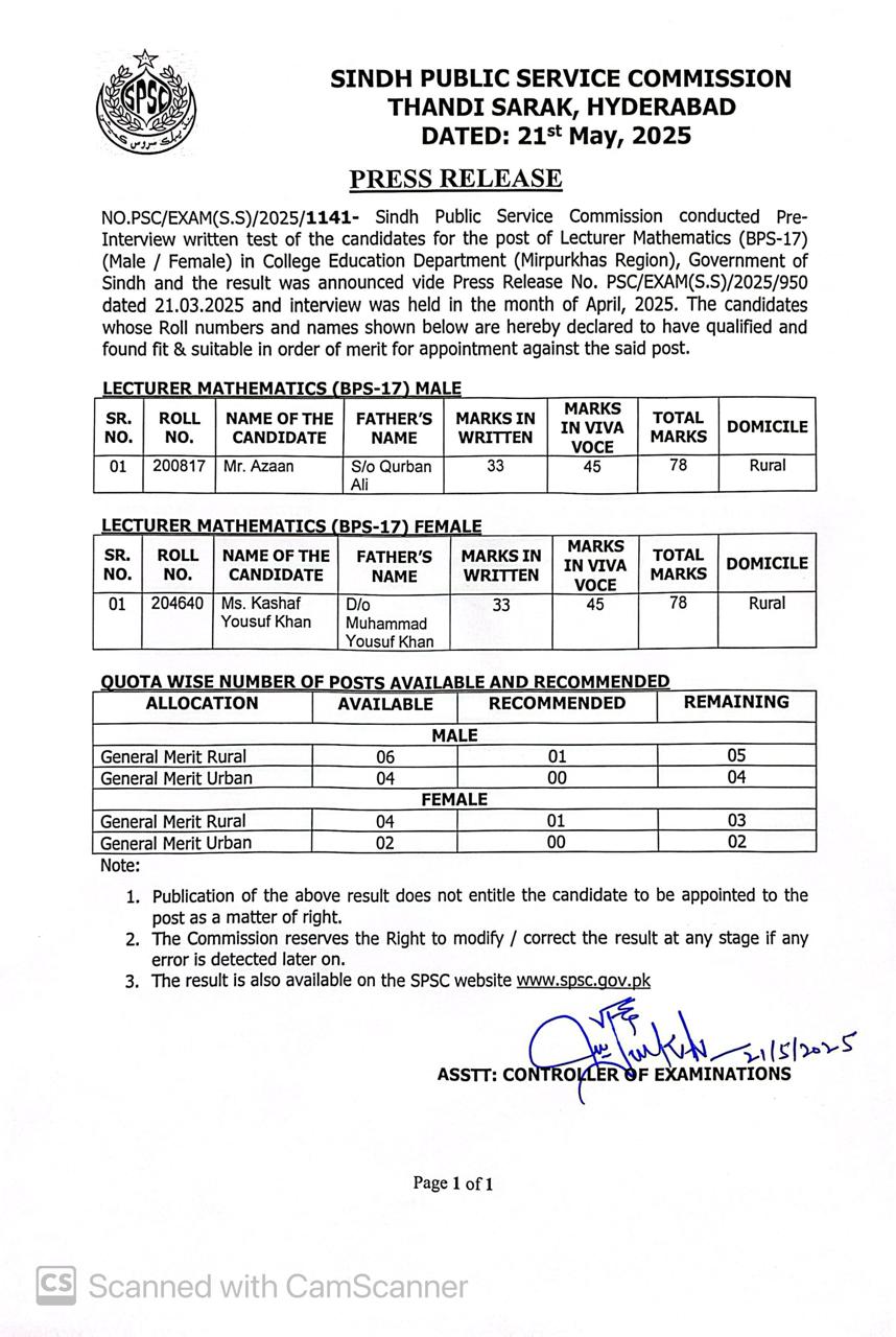 - Lecturer Chemistry (BPS-17) in College Education Department. (Click for Result)