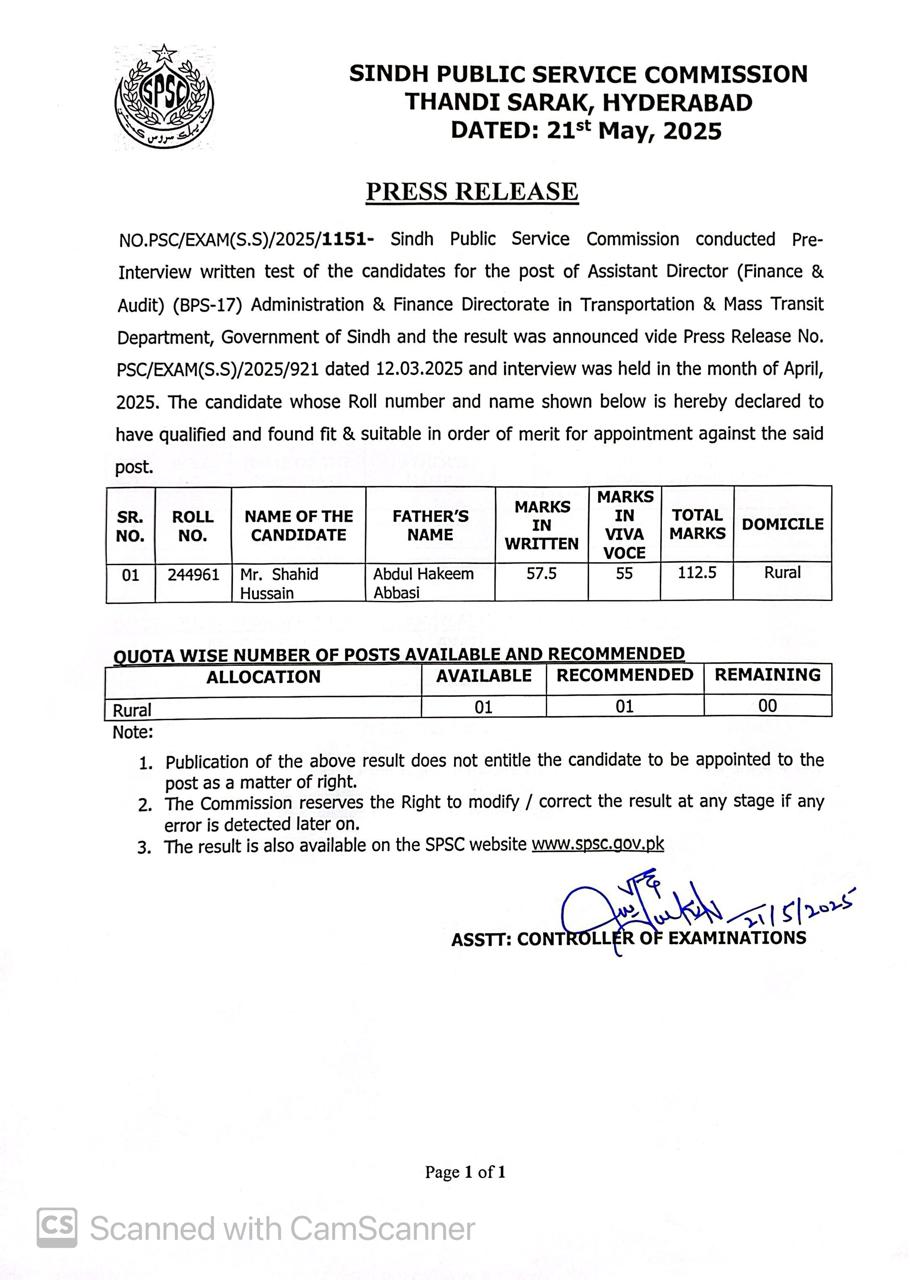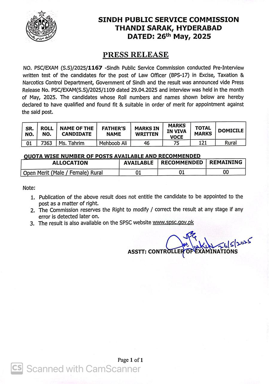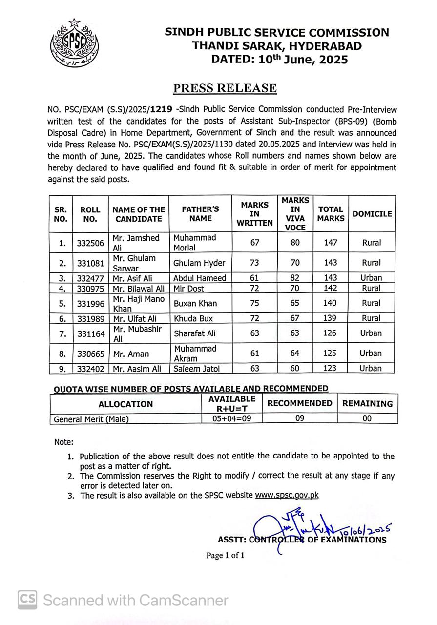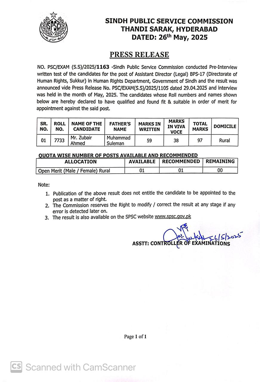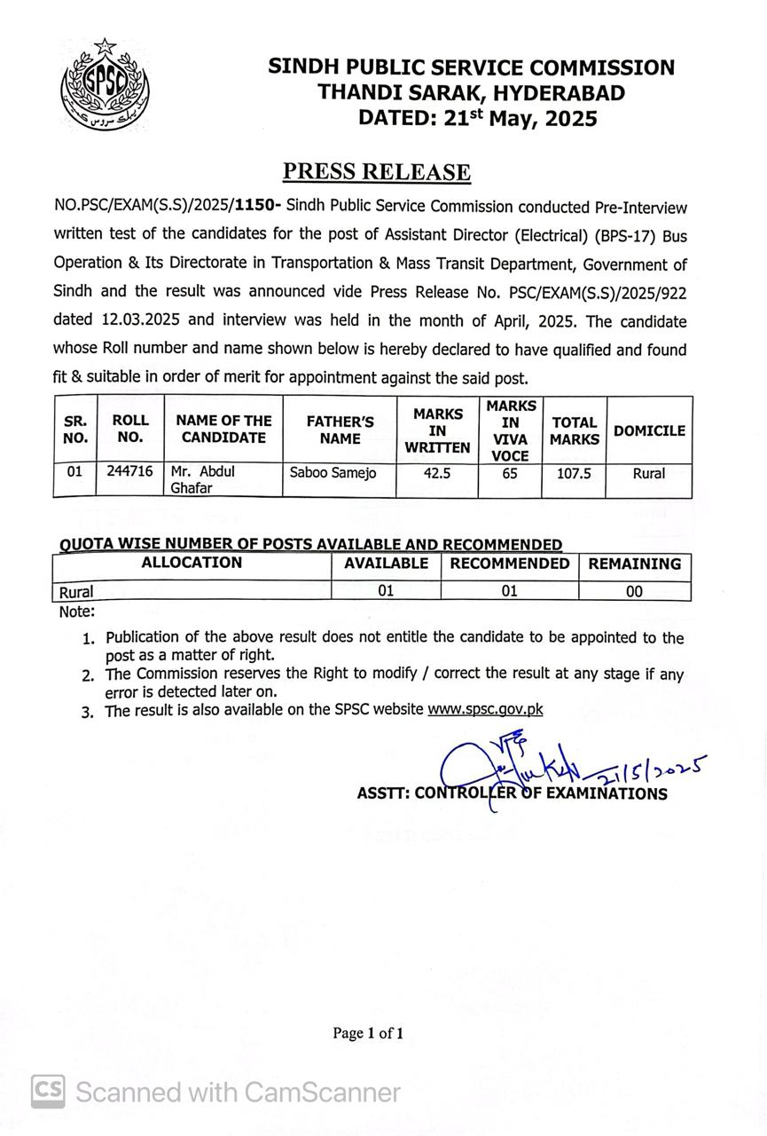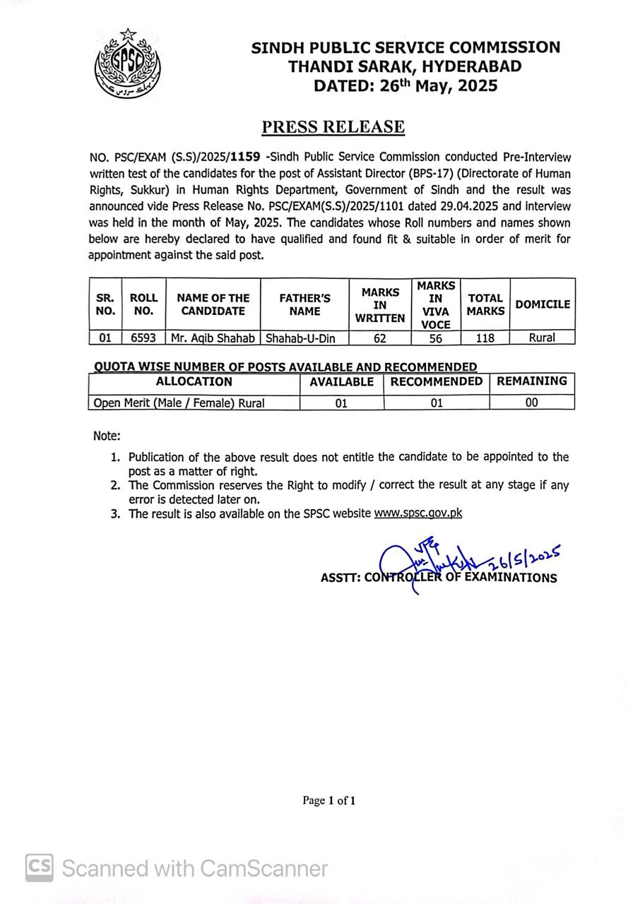 - Lecturer Chemistry (BPS-17) in College Education Department. (Click for Result)
